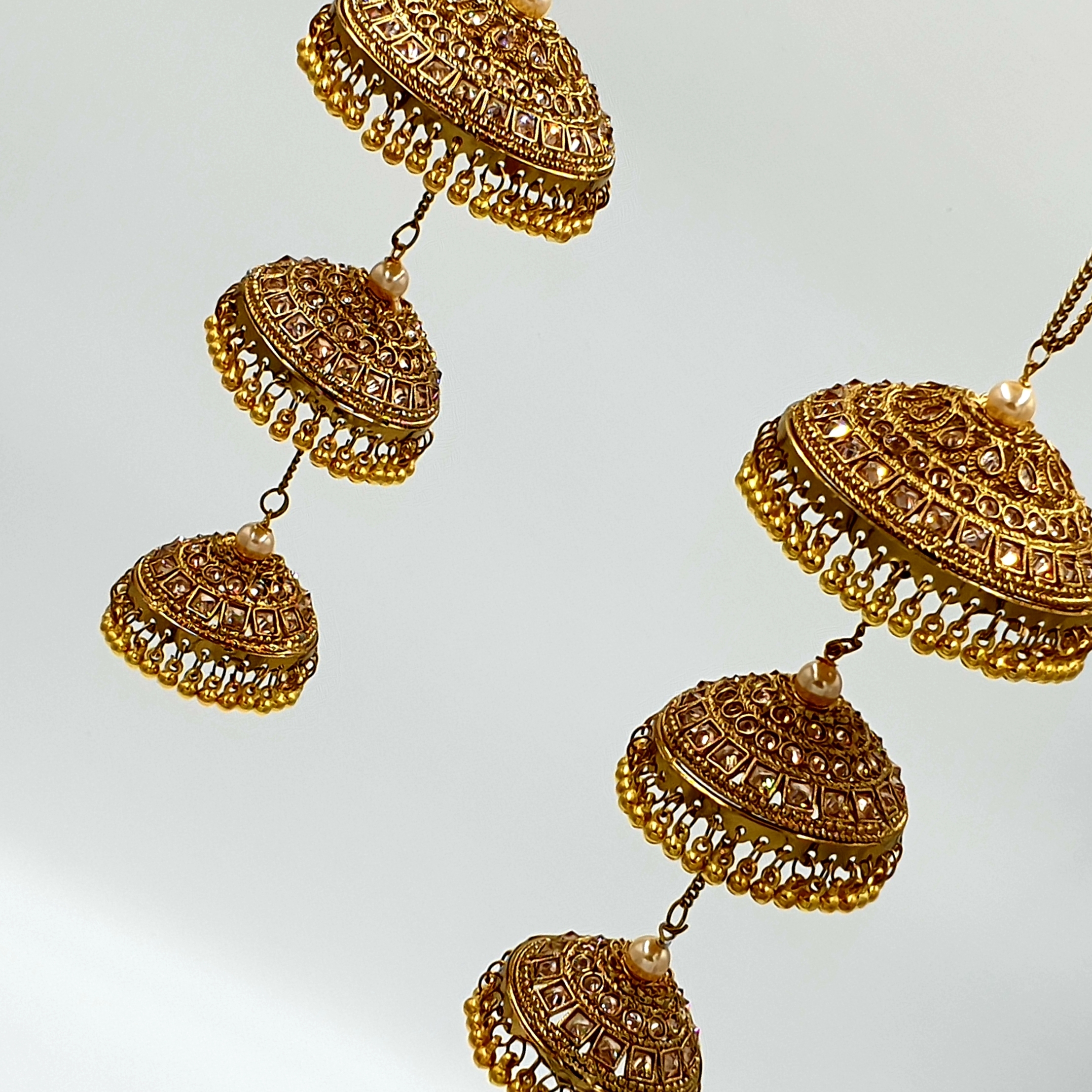 A striking antique gold keleera. Each layer is filled with small bronze polki stones. This beautiful kaleera is perfect to finish off your outfit for your special day.