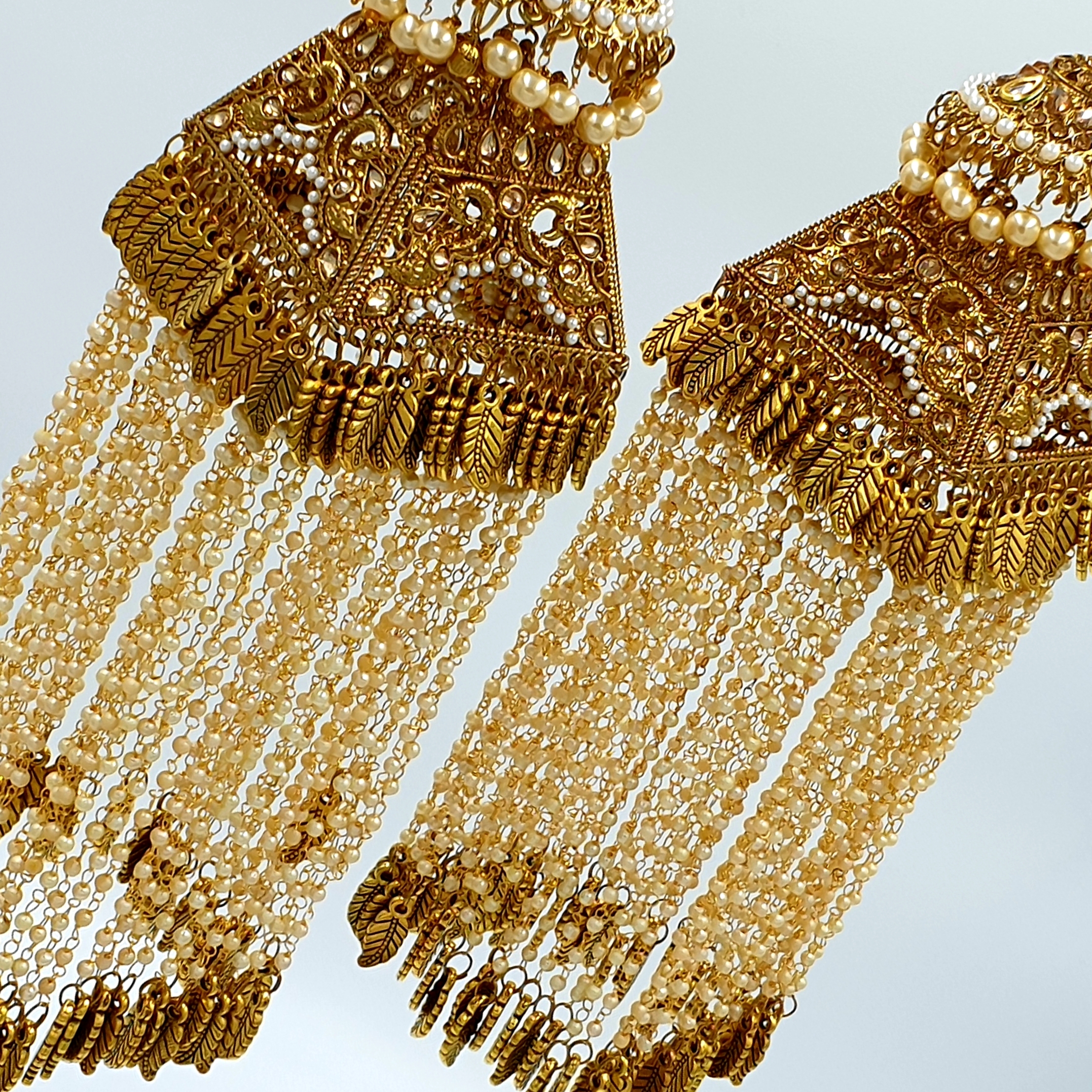 An exquisite elegant pair of kaleere with an intricate design and kundan stones. This beautiful piece has dangling small pearl chain with gold leaf charms.